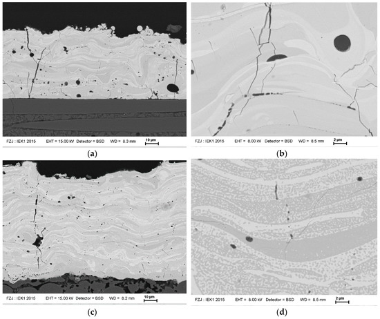 The as-sprayed samples were subjected to furnace thermal cycling, the used temperature program consists of four 20 h cycles at 1200 °C. SEM images of cross sections of samples in the as-sprayed state and after thermal cycling are presented in Figure 4. Additionally, higher magnification images of the interface region of the coatings are presented in Figure 5.