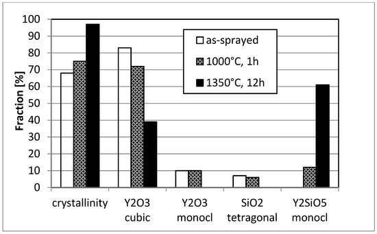In addition, the size of the segmentation and micro cracks is largely reduced due to sintering, some segmentation cracks are even no longer penetrating through the whole coating. Also the phase distribution changed significantly. While in the as-sprayed condition rather large regions with low and high silicon content appear (stemming from the impinging particles which have lost silicon during spraying mainly at their surface), the annealed coating shows much finer phases consisting of cubic Y2O3 (bright) and monoclinic Y2SiO5 (darker). The evolution of phases is shown in Figure 11 measured by XRD and using Rietveld refinement. Obviously, a short-term annealing at 1000 °C is not sufficient to form the equilibrium phases. As the coating is rather dense, the Y2O3 as a second phase has a reasonable corrosion resistance (Figure 1) and the microstructure probably will show some particulate toughening effects, the found coating is expected to perform good as EBC.
