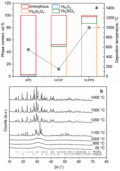 (a) Quantitative phase composition of the as-deposited coatings from Yb2Si2O7 feedstock using different thermal spray methods, (b) HT-XRD diffractograms of atmospheric plasma sprayed Yb2Si2O7 feedstock.