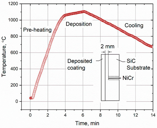 Recorded temperature measurements using a thermocouple during VLPPS deposition of Yb2Si2O7 on monolithic SiC substrate.