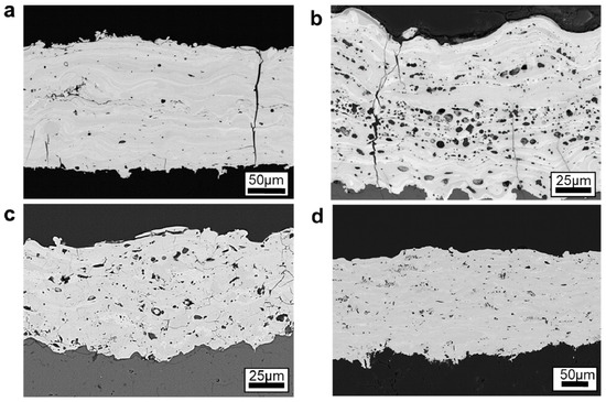 The microstructure of the coatings sprayed from Yb2Si2O7 feedstock with APS, HVOF and VLPPS processes can be seen in Figure 14. The two APS coatings (a,b) that were deposited at different temperatures (Figure 14a is the “standard” APS sample and b is deposited at a higher temperature, further details are discussed below) have vertical cracks running through the thickness of the coatings which is associated with the higher thermal stresses in these coatings due to the significant amount of Yb2SiO5 content (about 30 wt.% in these coatings determined after crystallization heat treatment). Because thermal expansion coefficient of Yb2SiO5 (7.5 × 10−6 °C−1) is larger than that of the Yb2Si2O7 (4.7 × 10−6 °C−1) as well as the SiC/SiC substrate (5.1 × 10−6 °C−1) [37]. This leads to greater tensile thermal stresses in the oxide coating after cooling, along with the tensile quenching stresses, which induce the vertical cracking. The high amorphous content in the APS layer would even further increase the CTE mismatch, however simultaneously due to a reduced Young´s modulus of the amorphous state, the effect on the stress level might be limited. Therefore, as cracks are not desired in the EBC microstructure, it is of crucial importance to minimize Si- evaporation during spraying.