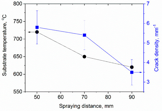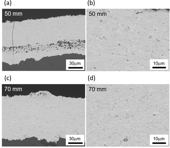 Figure 15 shows the cross-sectional microstructures of Yb2Si2O7 coatings fabricated by using the SPS technique with different spraying distances of 50 and 70 mm. As seen especially in the higher magnification images, bulk-like dense microstructure can be obtained within this work regarding gun power, spraying distance and particle size distribution in suspension feedstock. Vertical cracks in the coating microstructure were inevitable because of tensile stress from rapid cooling after spraying as can be seen in Figure 15c.