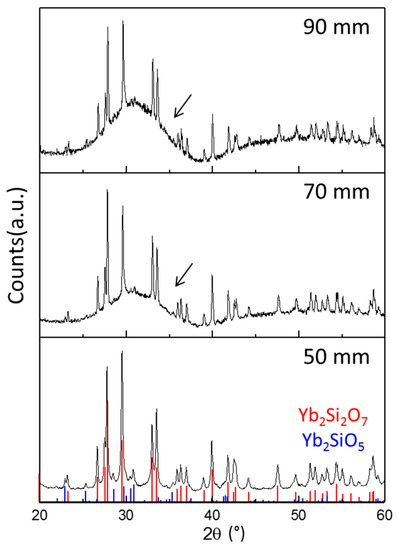 X-ray diffraction patterns from YDS EBCs fabricated by using suspension plasma spraying with spraying distance of 50, 70, or 90 mm. Arrows indicate amorphous baselines in XRD.