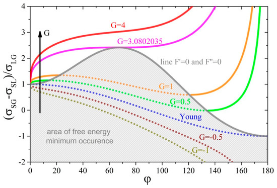 From the graph in Figure 2, there is one more important conclusion regarding the ranges of both small and large contact angles. Namely, for positive values of parameter G < 3.08 and the same parameters describing interfacial surfaces and volume of drop ( and ), there are at most three points (contact angles) for which the first derivative of free energy is equal to zero (necessary condition). However, only at one point does the second derivative of it take a positive value (sufficient condition), indicating the minimum of this function.