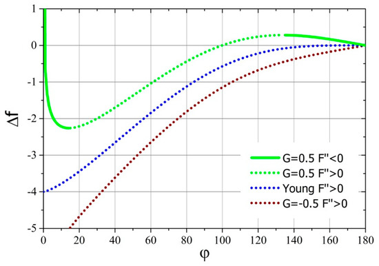 It should be stressed that the equation obtained in this way is the fundamental relationship applied in many works [16,17,18,19,20], with the dummy assumption that free energy can reach a minimum in every system considered; that is, its second derivative should be positive. It should be noted that the correctness of determining the contact angle under thermodynamic equilibrium conditions (minimum free energy of the system) also affects the description of phenomena related to mass and heat exchange during drops’ evaporation [21,22].