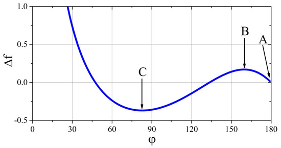 Owing to the above observations, it is worth discussing the case of the drop deposition in the system for which we choose a set of physicochemical parameters arbitrarily, for example, and . This kind of analysis will be performed on the basis of the plot of Equation (23), which is shown in Figure 4. It is noteworthy that the graph created will constitute the trajectory of the free energy changes of a precisely defined system during the gradual and stationary (quasi-equilibrium) spreading of the drop over the substrate.
