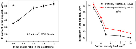 As shown in Figure 2a, the increase of In:Sn molar ratio in the electrolyte from 1.0 to 3.0 facilitated a higher In content in the deposit, from 30–35% to 60–63% (wt %).