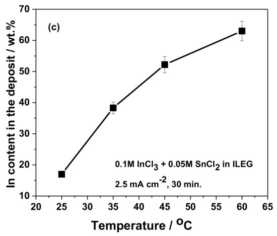 Higher values of the applied temperature, facilitate an increased content of In in the alloy, which was more pronounced in the temperature range of 25–40 °C, as illustrated in Figure 2c. This behavior is determined by the decrease of the viscosity of the electrolyte with the temperature, which consequently facilitates a faster diffusion of the In(III) species towards the electrode surface, thus producing an increased In content in the alloy [35]. This behavior is also in agreement with findings in references [15,22] during Sn–In alloy electrodeposition from aqueous sulfate electrolytes.