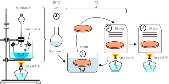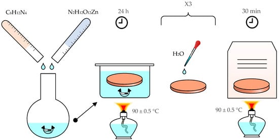 After a stirring treatment (3 h at room temperature), the seed solution C was used for the preparation of the sample. The sample was immersed in the solution during the stirring process (duration 5 min). Then, the sample was dried at 90 °C for 20 min. This process was repeated five times to ensure uniform seed application onto the sample. Finally, the sample was annealed at 90 °C for 30 min. Figure 1 illustrates the seed preparation protocol.