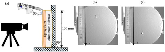 (a) Experimental setup for sliding speed measurement; (b) waterdrop image for the moment (t); (c) waterdrop image for the moment (t + Δt).