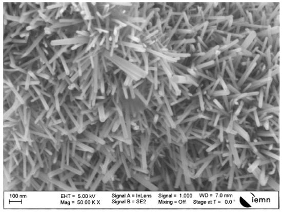 The obtained ZnO NRs on the epoxy layer after SEM analysis are shown in Figure 7. NRs nanostructure has a vertically orientation with an average length of 300 nm and a diameter of 30 nm. Obviously, the nanorods distribution is very dense with a great covering rate. This nanostructure helps to reduce the surface contact between waterdrops and the treated surface in order to create SHS beside the low-energy layer of ODS [].