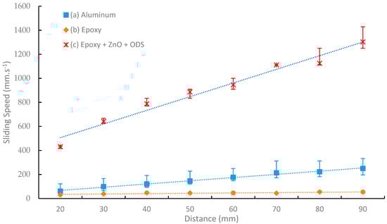 Sliding speed (SS) measurement for three surface stages: (a) nontreated aluminum surface; (b) epoxy-painted surface; (c) epoxy-painted surface treated by ZnO + ODS.