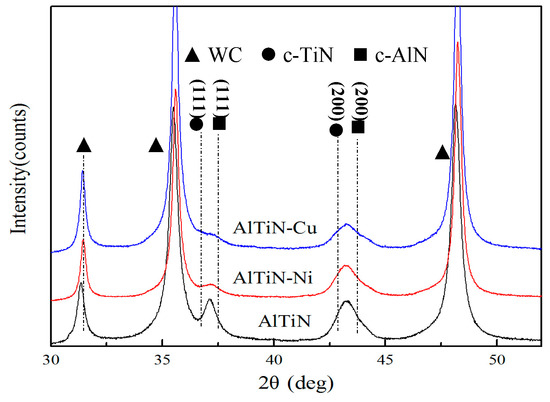 The chemical compositions of the AlxTi1-xN, AlxTi1-x-yN–Niy, and AlxTi1-x-yN–Cuy coatings, as analyzed using EPMA, are Al62.5Ti37.5N (named AlTiN), Al62.8Ti35.7N–Ni1.5 (named AlTiN–Ni), and Al63.1Ti35.5N–Cu1.3 (named AlTiN–Cu), respectively. The XRD patterns of the AlTiN, AlTiN–Ni, and AlTiN–Cu coatings, as deposited onto the cemented carbide substrate, are shown in Figure 1. Their single-phase centered cubic structures are shown. The AlTiN coating behaved between c-TiN (PDF#65-5759) and c-AlN (PDF#25-1495) due to the fact that the solid solution of Al had a smaller atomic radius. Following the addition of Ni and Cu, the (111) peak intensity sharply decreased and the (200) peak was broadened. These observations indicate a decrease in grain size and a weakening of the coating’s texture [24]. WC peaks were also observed, as shown in Figure 1.