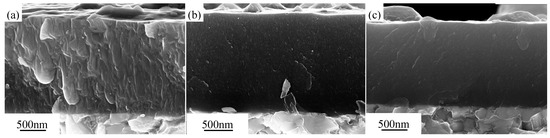 SEM fracture cross-section images of (a) AlTiN, (b) AlTiN–Ni, and (c) AlTiN–Cu coatings on polycrystalline Al2O3 after isothermal oxidation at 800 °C for 2 h.