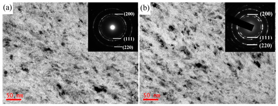 Figure 2 shows SEM fracture cross-sections for the AlTiN, AlTiN–Ni, and AlTiN–Cu coatings, deposited on the cemented carbide substrate. All of the coatings show dense structures, each with a coating thickness of ~3.0 μm. As indicated in Figure 2a, columnar grains are evident in the pure AlTiN coating, and these grains increase in size throughout the coating. The addition of Cu and Ni to the AlTiN coating (in Figure 2b,c) results in the transition from a continuous columnar grain structure into a comparatively smooth structure. To gain detailed information on the microstructure of the AlTiN–Ni and AlTiN–Cu coating, TEM fracture cross-sections and the selected area diffraction (SAED) results were examined, as shown in Figure 3. According to previous studies [9,24], the TEM and SAED results of the single-phase cubic AlTiN coating exhibit a columnar growth structure and spotty rings, respectively. As seen in Figure 3, the AlTiN–Ni and AlTiN–Cu coatings exhibit a discontinuous columnar growth structure, and the SAED results show that the AlTiN–Ni and AlTiN–Cu coatings have continuous rings. This indicates that grain size decreased with the addition of Ni and Cu. This can be attributed to the impurities in metal Cu(Ni) hindering grain growth. This stimulates the re-nucleation of grains during the coating deposition [22,23,24]. Myung et al. [20] found that ~1.5 at.% Cu is sufficient to form a dense nanocrystal TiN–Cu nanocomposite coating without a columnar structure. Chen et al. [24] have also reported similar results.