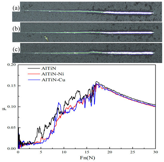 Images of a scratch on the surface and friction coefficient of (a) AlTiN, (b) AlTiN–Ni, and (c) AlTiN–Cu coatings.