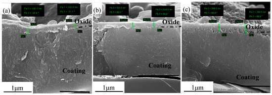 The oxidation resistance values of the coatings are closely related to their service behavior regarding cutting applications. Figure 6 shows SEM fracture cross-sections of the AlTiN, AlTiN–Cu, and AlTiN–Ni coatings on polycrystalline Al2O3 substrates, after isothermal oxidation at 800 °C for 2 h in a tube furnace. The AlTiN coating exhibited the best oxidation resistance, with oxide scales of ~0.19 μm. The oxidation resistance of the AlTiN–Ni coating was close to the value of AlTiN coating, with oxide scales of ~0.20 μm. The AlTiN–Cu coating had the lowest oxidation resistance, with the oxide scales of ~0.27 μm. In general, grain refinement has been shown to be effective in enhancing the oxidation resistance of coatings [28]. However, here, alloying with Cu and Ni leads to a drop in oxidation resistance owing to the additive Ni(Cu) significantly increasing the growth defects of MPs on the surfaces of AlTiN coatings. The growth defects of MPs on the surfaces of the coatings have an unfavorable effect on oxidation resistance, due to the resulting increase in the oxidation diffusion process [29]. When the temperature was increased to 900 °C (Figure 7), a similar case occurred. However, the oxide scales were increased, due to the higher oxidation temperature.