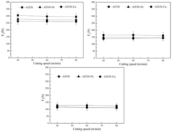 Cutting force of AlTiN, AlTiN–Ni, and AlTiN–Cu coated tools turning TiC4 alloys at various cutting speeds.