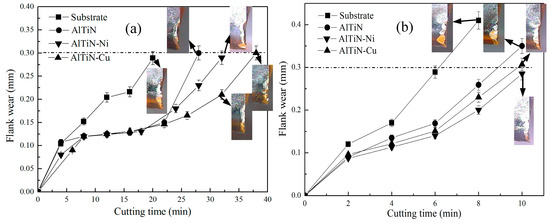 The flank wear versus cutting time at different cutting speeds: (a) 60 m/min and (b) 80 m/min.