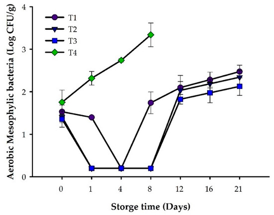 Meat is highly perishable due to characteristics such as pH, nutritional content, and water activity, among others. Additionally, meat products are highly susceptible to microbial growth and pathogenic microorganisms. As shown in Figure 1, the initial count of aerobic mesophilic microorganisms was higher than 1 Log CFU/g of meat for all treatments, decreasing on day 4 for T1 and day 8 for T2 and T3, reaching a value of 0.2 Log CFU/g. However, a progressive increase was observed for T4 until reaching more than 3 Log CFU/g, showing a significant difference (p > 0.05) between treatments, with T3 being the most effective treatment for bacterial growth reduction, followed by T2 and T1.