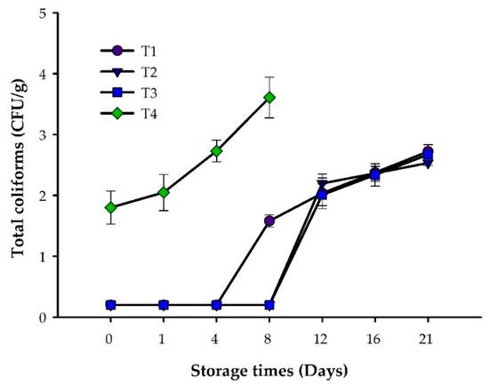Figure 2 shows the effect of treatments on total coliforms, with an immediate effect obtained on day 0 starting at 0.2 Log CFU/g and reaching notable growth on day 4 for T1, and day 8 for T2 and T3, with significant differences between these treatments concerning the control. The control reached values higher than 3 Log CFU/g on the final storage day, while T1, T2, and T3 showed a reduction by 1 Log CFU/g. These results were similar to the findings of Lee et al. [36], who evaluated microperforated films in pork medallions and obtained a minimal reduction of 0.2 Log CFU/g on day 1 in aerobic mesophilic bacteria and total coliforms. This reduction was maintained until day 7 in storage, followed by a significant increase until day 14. However, Chang et al. [37] evaluated edible chitosan coating and glucose concentrations in pork meat over the course of 7 days and found lower values than the present study. The authors observed values of 2.68 Log CFU/g in treatments, that were higher than the control at the initial day of the storage period to aerobic mesophilic, followed by increased growth of the microbial population until the end of the storage time. Meanwhile, a previous study [10] reported higher values than the present study, where values increased during storage time (12 days) using edible chitosan coating with natural extract and obtaining fast growth in the control compared to the coating treatments, which reached a reduction of 3–4 Log CFU/g. This effect could be due to a wide variety of factors, such as molecular weight, concentration, viscosity, deacetylation grade, pH, and temperature, which have been reported to influence chitosan antimicrobial capacity [38].