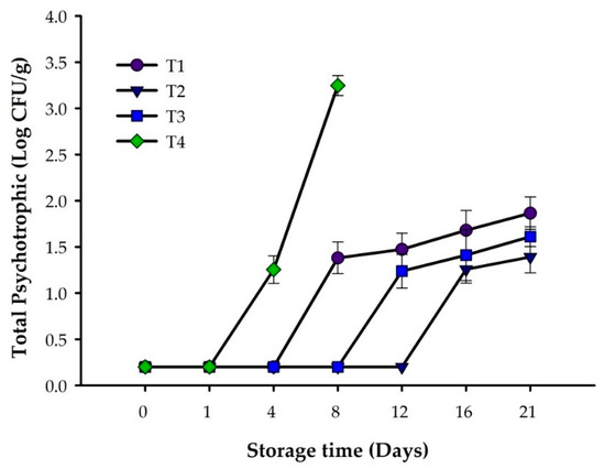 Psychrophilic bacterial growth (Figure 3) was initially at 0.2 Log CFU/g for all treatments, and this growth increased as storage time advanced for T4 at day 4, T3 at day 8, and T2 at day 12, showing significant differences (p > 0.05) and reaching a reduction of 3 Log CFU/g at the end of storage. T2 obtained the best result, followed by T3 and T1. Chang et al. [28] evaluated edible chitosan coating with glucose concentration and observed a similar behavior, i.e., a reduction of 1 Log CFU/g. They mentioned that the preservation effect of edible chitosan coating in pork could be a consequence of the added antimicrobial compounds thereby improving the attributes of the samples.