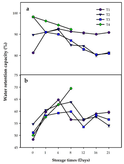 The WRC in fresh and cooked pork samples after treatment is shown in Figure 4. The initial values for the fresh samples were 81.26, 89.75, 98.13, and 98.21 for T1, T2, T3, and T4, respectively. Day 1 showed an increase in T1 and T2, followed by a decrease during the storage days, reaching values of 90.82 (T1), 81.33 (T2), 80.95 (T3), and 92.30 (T4). A previous study [44] evaluated the effect in pork WRC during storage and obtained similar results to the present study, showing an initial value of 96.2% and a final value of 93.8% during the first 7 days; where these values increased until the final day of storage. This behavior may have been due to there being no changes in the total water content, which was produced during aging in the samples. This result could explain the results in the present study and the findings of other studies reporting that pH values higher than or equal to 5.8 would benefit the capacity of protein binding to water molecules [43]. Regarding the WRC of the cooked pork (Figure 4b), the values were initially 48.31, 54.69, 51.14, and 50.03 for T1, T2, T3, and T4, respectively. These values showed a variable tendency in all treatments during the storage period, starting at day 12 with constant behavior and finishing at higher values than the initial ones. The control obtained the highest value (69.49), followed by T1 (60.94), T3 (56.57), and T2 (54.06). The same behavior was observed in Reference [45], where values ranging between 54% and 79% using different methods in cooked pork WRC were obtained. Meanwhile, Reference [46] evaluated untreated pork to observe the changes during sample aging, and they obtained an initial value of 60% and a final value of 57% over 14 days. High pH values can protect proteins from denaturalization, indicating a close relationship between quality parameters and other factors, such as cooking method, temperature, type of muscle in samples, species, and maturity state, among others [44,47].