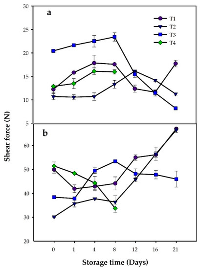 Shear force in (a) raw and (b) cooked pork fillet coated with chitosan and tomato plant extract during refrigerated storage for 21 days. Vertical bars show the standard deviations.