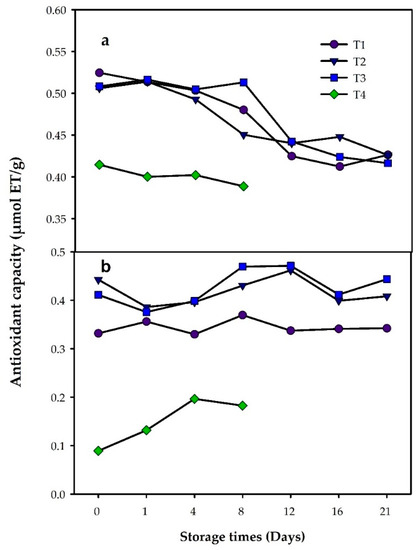 Figure 6 shows the effect of edible chitosan coating on pork from the ABTS (Figure 6a) and DPPH (Figure 6b) antioxidant assays. The antioxidant capacity by ABTS of the treated meat (T1, T2, and T3) was significantly higher (p < 0.05) than that of the control (T4) after 21 and 8 days of storage, with values of 0.426–0.431 µmol TE/g and 0.382 µmol TE/g, respectively. No differences were found between the different treatments. On the other hand, at the end of the storage time, T3 obtained a higher value of antioxidant capacity using the DPPH assay, followed by T2 and T1, at 0.443, 0.412, and 0.342 µmol TE/g, respectively, showing a significant difference between the treatments (p < 0.05). Moreover, all treatments were significantly different (p < 0.05) with respect to the control, which had a value of 0.172 µmol TE/g after 8 days of storage. Huang et al. [50] evaluated the antioxidant capacity in fresh and cooked mutton and pork treated with Nelumbo nucífera root and leaf extracts, and they obtained similar results to the present study, showing higher antioxidant capacity with respect to the control.