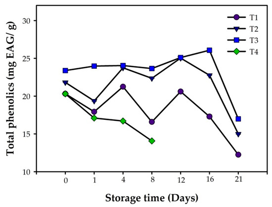 The effect of edible coatings on the TPC in pork samples is shown in Figure 7. T3 obtained the highest content with initial and final values of 24 mg GAE/g and 17 mg GAE/g, respectively, followed by T2 and T1. These results showed a significant difference (p < 0.05) between the treatments and the control, following variable behavior during the storage period. Antioxidant capacity and total phenolic compounds have been evaluated in some studies using natural extracts in meat preservation [37,50,51] that use edible coatings. The authors related higher antioxidant capacity with TPC in the samples, which provided a tool for counteracting the major deterioration problems.
