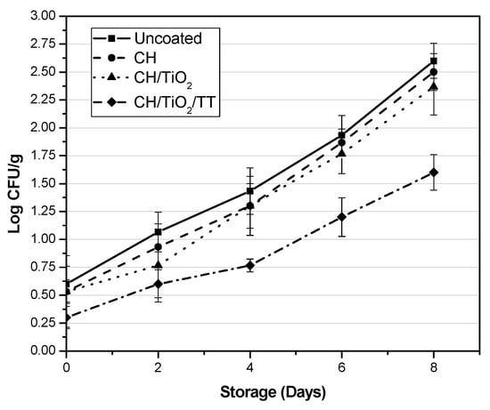 Figure 1 shows the total mold and yeast population counts of coated cantaloupe samples with or without nano-treatment. The microbial population growth was comparable for total mold and yeast population counts [30]. The high sugar and pH contents can promote microbial growth [31]. The uncoated samples reached the highest microbial limit earliest during the whole storage which was 8 days. When coatings combined with TiO2, all coated samples had lower fungal growth compared to the control. The reduction of fungal growth in coated samples can be due to the chitosan combination with nano-material [32,33].