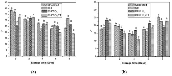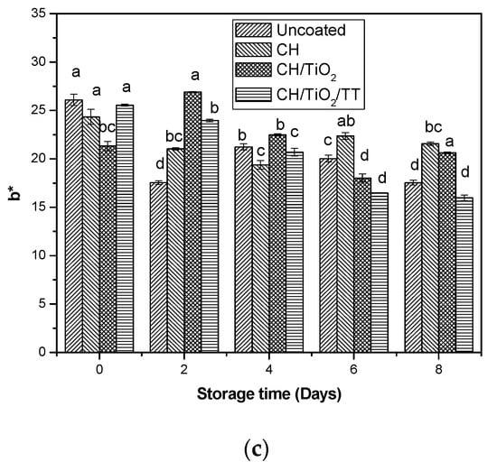Lightness (L*) values ranged from 26 to 38 on day 0. Though a little particular trend was established of fruit lightness, CH/TiO2/TT samples remained lighter (Figure 2a). Uncoated and CH samples showed more signs of darkening. CH/TiO2 treatment affected (p > 0.05) the redness degree (a* values) in a comparison to the control samples (Figure 2b). The value of b* for uncoated samples is significantly higher than that of CH/TiO2/TT at days 4, 6 and 8 (Figure 2c). This result recommends that nano-coating preserved the yellowness to a certain grade. The same results for color determination have been estimated for CH and control samples [34].