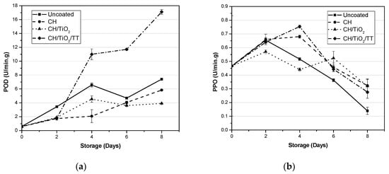 Figure 3a shows the effects of coating treatments on the POD activity of fresh-cut cantaloupes. Generally, cantaloupes had lower POD activity as compared to the other uncoated samples (day 0) regardless of treatments. This could be due to the low O2 level developed in the fruit coatings [39]; and the possible reduction of carotene which can be one of the important factors of POD activity [40]. On the other hand, CH/TiO2/TT samples had higher POD activity as compared to other samples during storage.