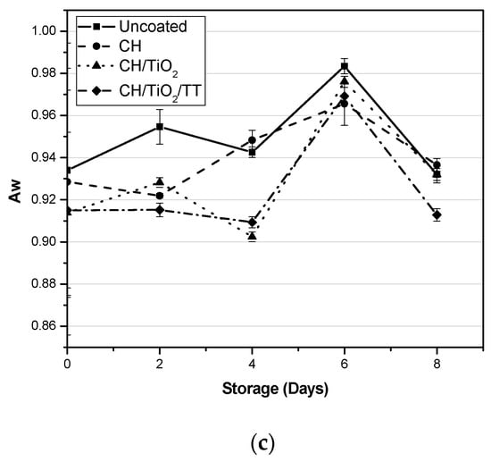 The AW can define as the free moisture content (MC). CH/TiO2/TT-treated sample had a lower AW than uncoated sample (p < 0.05). This result can be due to CH/TiO2/TT-treated samples contained antimicrobial agents, which promoted the interaction of water and sugar molecules via hydrogen bond [43].