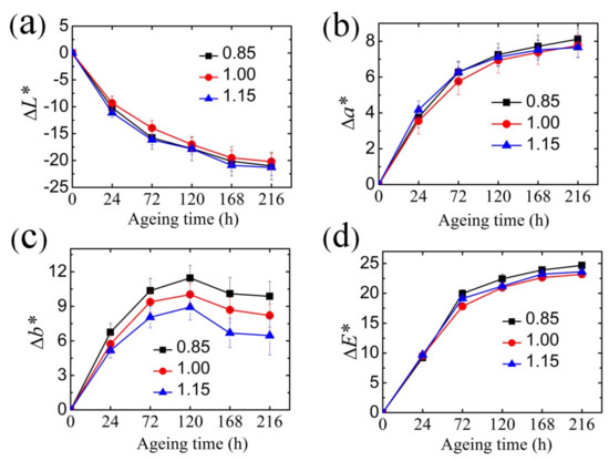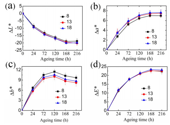 where ∆L*, ∆a*, and ∆b* represent the total changes in L*, a*, and b* during the ageing test, respectively. Six replicate measurements were performed on defined points on the sample surfaces.