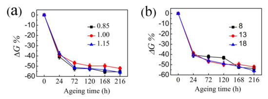 Figure 3 shows the ΔG% of the scrimbers during the artificial xenon light exposure. With increasing ageing time, all scrimbers showed a decrease in ΔG%. The loss in gloss for all scrimbers was very rapid for the first 24 h. The gloss changes during the accelerated ageing were correlated with the density and resin content. After 216 h of exposure, the smallest ΔG% values of −56.00% and −55.99% were observed for the scrimbers with a density of 1.15 g/cm3 and a resin content of 18%, respectively. All samples showed a significant reduction in gloss, suggesting that the scrimbers lost their gloss after ageing.