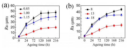 The changes in Ra of the scrimbers with different densities and levels of resin content during artificial xenon light exposure are shown in Figure 4. With an increasing ageing time, all scrimbers showed an increase in Ra. After 216 h of exposure, the highest Ra values of 44.17 and 47.77 μm were observed for the scrimbers with a density of 0.85 g/cm3 and a resin content of 8%, respectively. The scrimbers with a density of 1.00 g/cm3 and a resin content of 13% showed the lowest Ra value (19.95 μm) after 216 h of irradiation. The density and resin content affected the changes in the surface roughness during the ageing process.
