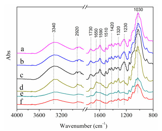 Attenuated total reflectance (ATR)-FTIR spectra of scrimbers before and after artificial ageing. (a) Resin content of 18%; (b) resin content of 13%; (c) resin content of 8%; (d) weathered, resin content of 18%, (e) weathered, resin content of 13%; and (f) weathered, resin content of 8%.