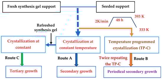 Preparation routes of the secondary growth (route A), tertiary growth (route B), and periodical secondary growth method (route C).