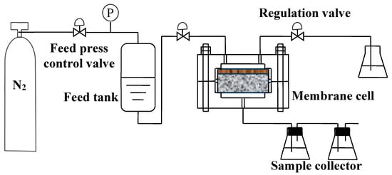 Desalination performance (here used for removal of NaCl) of the TS-1 membranes was carried out in reverse osmosis (RO) modes, similar to previous studies [,]. The setup was performed in a laboratory obeying the flow diagram, as shown in Figure 2. The membrane was first installed into the membrane cell and placed into the unit as shown. The feed vessel, including temperature control, was filled with sodium chloride (NaCl) solution (0.1 mol/L). The operating pressure (1.4 MPa) was supplied by feeding N2 into the vessel and was maintained constantly during the test. The desalination experiments were conducted in a cross-flow setup with the NaCl solution being fed under pressure on the outside and permeating to the inside of the membrane. The test temperature was controlled at 298 K. The collected flush sample was analyzed for Na+ anions using an inductive coupled plasma (ICP) emission spectrometer. The resulting flux was measured, while the separation factor (Na+ rejection) was calculated by rejection (%) = (CNa,f − CNa,p)/CNa,f × 100, where CNa,f and CNa,p were ICP-measured Na+ concentrations in the feed and permeate solutions, respectively [,].