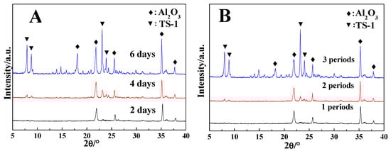 XRD patterns of the (A) period-TS-1 and (B) second-TS-1 membranes with varied crystallization times (2–6 days, with 1–3 periods).