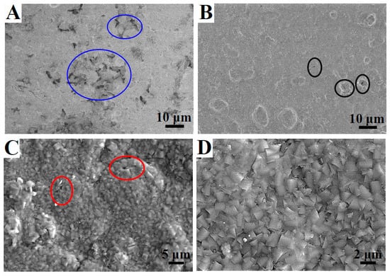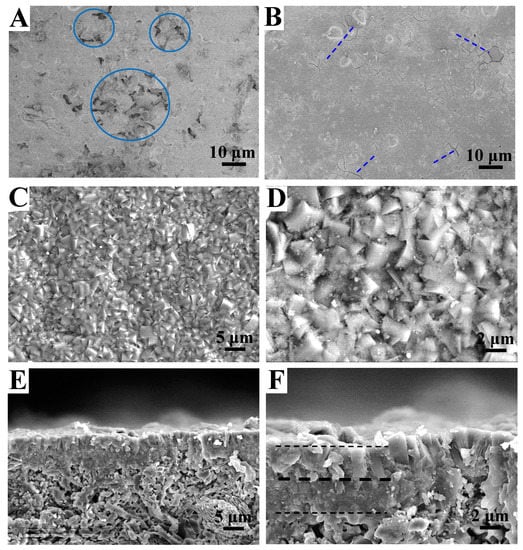 Top and cross-section view SEM images of the second-TS-1 membrane synthesized with varied crystallization times: (A) 2 days, (B) 4 days, (C–F) 6 days; blue circles mark the bare support, black circles mark the cracks, red circles mark the pinholes, while the black dashed lines mark the membrane interface.