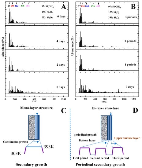 ESI-MS spectra of the synthesis gel during the crystallization process for the second-TS-1 (A) and period-TS-1 membranes (B). Scheme of the growth modes of the secondary growth (C) and the periodical secondary growth (D) methods.