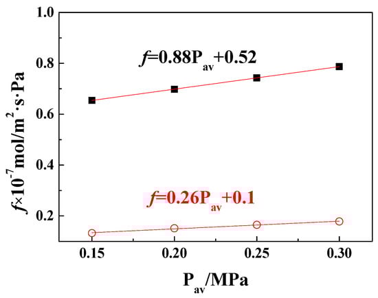 These results suggest that the crystallization over 6 days or 3 periods favored the formation of the continuous TS-1 membrane. To check the membrane quality, He permeance was first tested. The permeance was defined as f = F/L = Q/S(Ph − Pl), where f is the permeance (mol·s−1·Pa−1·m−2), F is the permeability (mol·m·s−1·Pa−1·m−2), L is the membrane thickness (m), Q is the molar gas flow rate (mol·s−1), S is the membrane area (m2), and Ph and Pl are the upstream and downstream pressure (Pa), respectively. The value for the as-synthesized second-TS-1 membrane was measured as 5 × 10−8 mol·s−1·Pa−1·m−2, which indicates a defective feature. However, an undetectable He permeance (< 10−10 mol·s−1·Pa−1·m−2) was observed for the period-TS-1 membrane, suggesting it is defect-free. It is believed that the TS-1 membranes still held distinguish He gas permeance properties after being activated by the Pd/SiO2 catalytic cracking method [,]. The He permeance is plotted as a function of varying average pressure and the following dusty gas model is used to fit the data: f = α + β·Pav, where the permeability coefficients α and β are attributed to Knudsen and viscous flow in the zeolite membrane, respectively. The obtained α and β values were compatible with the evaluated pore size. Generally, the zeolite pore (< 1 nm) contributes to the Knudsen diffusion, while the nonzeolite pores (> 1 nm) caused by the defects result in the viscous flow. The low viscous flow coefficient (0.26) was derived after linear fitting (Figure 7) based on the dusty gas model [,,,], indicating negligible viscous flow for the period-TS-1 membranes. This suggests a low defect-free structure in the period-TS-1 membrane. The higher viscous flow coefficient value of 0.88 may indicate a certain number of defects in the second-TS-1 membranes. The difference between period-TS-1 and second-TS-1 membranes was also confirmed by a permporometry measurement of the pore size distribution for the activated zeolite membrane. The period-TS-1 membrane displayed a mono pore size of 0.5–0.6 nm, which was the same as its zeolite pore size (0.5–0.6 nm). A wide pore size distribution of 0.4–2 nm was observed on the second-TS-1 membrane (Figure 8). These pores, except those measuring 0.5–0.6 nm, were regarded as defects (pinholes or cracks) [], and resulted in higher Knudsen diffusion permeance (0.52×10-7 mol·s-1·Pa-1·m-2) than that of the period-TS-1 membrane. These results are consistent with the above SEM findings. As discussed in the former section, the reduction of defects (the nonzeolite pore) is related to the upper surface layer, with which the possible pinholes in the bottom layer can be covered and eliminated. The monolayer structure of the second-TS-1 membrane, prepared by the continuous heteroepitaxial growth, may not have “eliminated” this effect, thus resulting in defective membranes [,,].