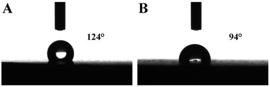 Another function of the bottom layer is to suppress the release of Al from α-Al2O3 base substrate. The mole ratio of Al/Ti/Si for the period-TS-1 membrane, obtained by a surface EDX analysis (Figure 9), was determined to be 1.01:2.45:100, while that of the second-TS-1 membrane was 6.09:1.42:100. The lower Al and lower Ti contents of the period-TS-1 compared to second-TS-1 membrane indicates the inhibition of Al release from the support by the bottom layer. The low Al content in the period-TS-1 membrane results in hydrophobic characteristics, as evidenced by the water contact angle of 124° (Figure 10A). A weak hydrophobic nature is noted for the second-TS-1 membrane, with a water contact angle of 94° (Figure 10B). This indicates the superiority of the bilayer structure for enhancing hydrophobicity.