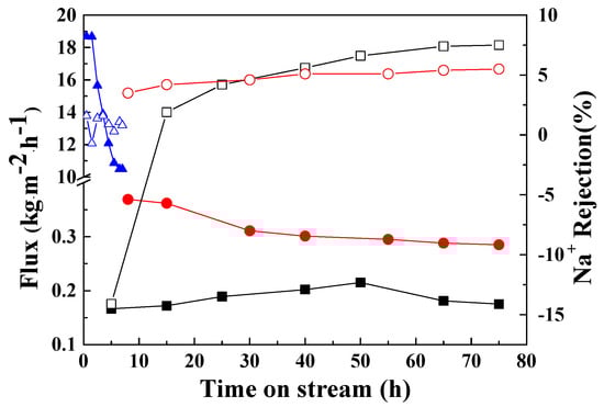 Flux (solid symbol) and Na+ rejection (open symbol) in RO mode for the period-TS-1 (■□), defect-period-TS-1 (▲△), and second-TS-1 membranes (●○).
