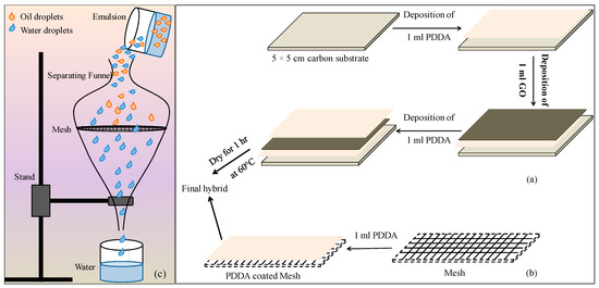The self-cleaning nanoscale coating was performed via layer-by-layer deposition method (Figure 1a,b). 1 mL of PDDA was deposited on carbon substrate. In continuation of this, 1 mL of GO was further incorporated above that layer. This assembly was covered by another layer of PDDA. This procedure was repeated for three times. Finally, substrate was placed in the oven at 60 °C. Consecutively, 1 mL of PDDA was deposited on top of the stainless-steel mesh. The carbon substrate along with the mesh is considered to be nanoscale hybrid system and used to separate oil–water mixture. Figure 1c shows the schematic representation of the apparatus used to perform the experiment.
