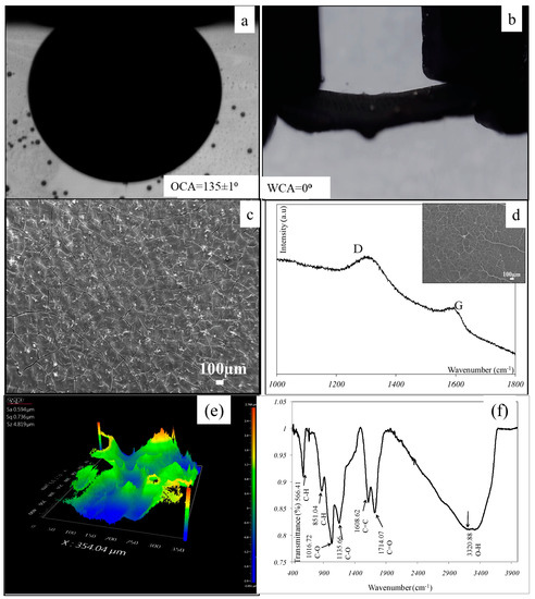 Figure 2a shows the underwater contact angle of crude oil at the coating i.e., 135°. This shows the oleophobic nature of the nanoscale coating. Figure 2b shows the scanning electron image of graphene oxide while Figure 2c represents the secondary electron image of PDDA coated graphene oxide-based coating. This shows that coating is well uniformed. In Figure 2d Raman spectrum of graphene oxide shows the presence of D and G bands at 1200–1300 cm–1 [25] and 1500–1600 cm–1 [26] respectively. D band occurs due to disordered structure of graphene while G band represents the graphitic nature. The comparison between GO and GO/PDDA coatings are shown in Supplementary information Figure S4. This shows the red shift in D and G bands. More details can be found in Supplementary Information (Section 1.10). Surface roughness of the coating is investigated by the 3D optical surface profiler (Figure 2e). 3D topographical image shows the surface roughness of the sample. Surface roughness of the coating is 4.18 µm. This shows that surface roughness plays an important role in the wettable properties of the coating and contributes in the separation of oil–water mixture.
