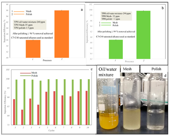 This is expected to reduce the TPHs and PAHs significantly. The TPHs and separation efficiency are calculated by gas chromatography coupled to Flame ionization detector (GC-FID) and Total petroleum hydrocarbons (TPHs) analyzer. Figure 4a,b show the separation efficiency of the nanohybrid for two-stage process. The separation efficiency is calculated through the formula