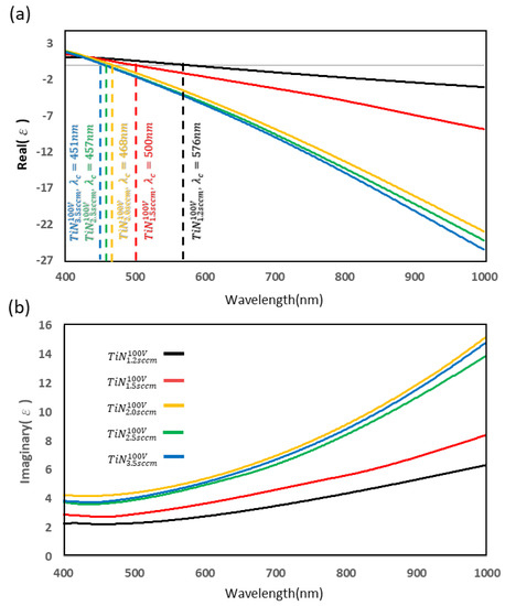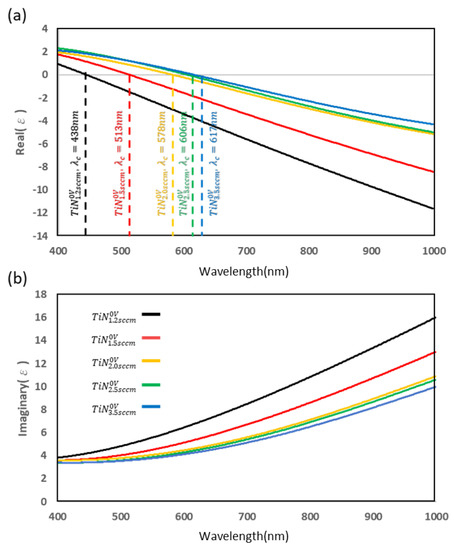 2 flow rate of 3.5 sccm, the sample had the most negative real part of the permittivity, which varied from zero at a wavelength of 451 nm to −25.5 at a wavelength of 1000 nm, which is similar to that of gold. Accordingly, increasing the N